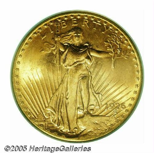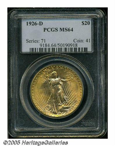 <B>1926-D<$20> MS64 PCGS.</B></I> This is a lower mintage issue with just 481,000 struck. Most examples of this issue were melted, with few survivors. Certainly a few reached circulation, but most of those that were released found immediate storage in bank vaults. The typical '26-D Saint that reaches the market today is in Mint State, but at the lowest levels, either MS60 or MS61. This is one of the most underrated of all Saint-Gaudens Double Eagles. Note for example, that PCGS has only certified 14 examples at this grade level, and just five Gem quality coins.<BR> For the grade of this coin, it is hard to imagine a more attractive example. The surfaces have frosty luster with rich orange-gold coloration. It is a sharply struck example with nearly every detail boldly evident, except for the peripheral details at the bottom obverse. The dome of the capitol, for example, is ill-defined. Despite this weakness in design, the overall aesthetic appeal and technical appearance are not affected. There are only a few small marks in the fields, and these are convenient pedigree markers, should the collector consider it desirable to learn the ownership history. We would certainly like to discover the past pedigree, a pursuit that must wait for a quieter time. Like the 1925-S, to which it compares favorably in terms of overall rarity, the 1926-D is one of the most underrated Saint-Gaudens Double Eagles at the finer levels of Uncirculated preservation. Population: 14 in 64, 6 finer (5/05).