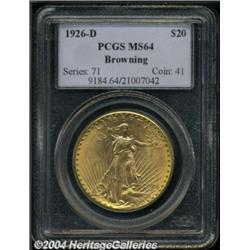 <table><tbody><tr><td><table> <TR><TD width="100%"><TABLE cellSpacing=1 cellPadding=3 width="100%" border=0><TBODY><TR><TD width="100%" bgColor=#79735c><FONT face=arial color=#ffffff size=3><B>Description</B> </FONT></TD></TR><TR><TD width="100%" bgColor=#ffffff><FONT face=arial size=2><B>1926-D $20 MS64 PCGS.</B></I> Ex: Browning. While the term unheralded rarity almost seems out of place in an analysis of post-1923 Double Eagles from the Denver Mint and an issue that was once one of the two most prized issues in the entire Saint-Gaudens series, the true scarcity of the 1926-D Twenty seems to currently be overlooked by all but the most knowledgeable gold collectors. Perhaps this is due to the fame that accrues to the 1927-D.<BR>An important coin in its own right, particularly in Choice and better Mint State grades, this sharp, well frosted golden-orange representative can be equaled or exceeded by perhaps fewer than 20 examples of the issue. Both sides exhibit a warm, satiny glow with surface marks that are generally light and well scattered, the most obvious being a paper-thin blemish out from Liberty's right (facing) shoulder. An outstanding '26-D Saint that should encounter considerable bidder interest from specialists. Population: 9 in 64, 6 finer (10/03).<BR><I>From a Magnificent Collection of Double Eagles.</B></I> </FONT></TD></TR></TBODY></TABLE></TD></TR></TBODY></TABLE><BR><A name=PricesRealized></A><TABLE cellSpacing=0 cellPadding=0 width="100%" bgColor=#000000 border=0><TBODY><TR><TD width="100%"><TABLE cellSpacing=1 cellPadding=3 width="100%" border=0><TBODY><TR><TD width="100%" bgColor=#79735c><A name=PR><FONT face=arial color=#ffffff size=3><B>Previous Prices from Heritage Auctions</B> </FONT></A></TD></TR><TR><TD bgColor=#f6f6ed><TABLE cellSpacing=0 cellPadding=0 width="100%" border=1><TBODY><TR><TD align=middle width="33%"><B>Date</B></TD><TD align=middle width="33%"><B>Service</B></TD><TD align=middle width="33%"><B>Price</B></TD></TR><TR bgColor=whitesmoke><TD width="33%"><B>01/07/2004</B></TD><TD width="33%">PCGS</TD><TD width="33%">$33,350.00</TD></TR></TBODY></TABLE></TD></TR><TR><TD bgColor=#ffffff><FONT face=arial size=1 ?>PLEASE NOTE: All prices realized reflect the final hammer price PLUS the buyer's premium in auctions that charge a buyer's premium. Each item has a notation at the top of the listing indicating whether that lot included a buyer's premium. Example: A item that sells with a final hammer price of $100 and a 20% buyer's premium will display with a price realized of $120. All information listed is intended to be as accurate as possible, but errors are possible. Please use this guide carefully and inform us of any inaccuracies. </FONT></TD></TR></TBODY></TABLE></TD></TR></TBODY></TABLE><BR><TABLE cellSpacing=0 cellPadding=0 width="100%" bgColor=#000000 border=0><TBODY><TR><TD width="100%"><TABLE cellSpacing=1 cellPadding=3 width="100%" border=0><TBODY><TR><TD width="100%" bgColor=#79735c colSpan=6><FONT face=arial color=#ffffff size=3><B>Price Guide*</B> </FONT></TD></TR><TR bgColor=#f6f6ed><TD align=middle><B>Grade</B> </TD><TD align=middle><B>Coin World<BR>(Trends)</B> </TD><TD align=middle><B>Numismedia<BR>Retail</B> </TD><TD align=middle><B>Numismedia<BR>Wholesale</B> </TD><TD align=middle><B>Coin<BR>Universe</B> </TD><TD align=middle><B>Heritage<BR>Value Index</B> </TD></TR><TR bgColor=#ffffff><TD align=middle>63</TD><TD align=right>$25,000.00</TD><TD align=right>---</TD><TD align=right>$16,275.00</TD><TD align=right>$22,500.00</TD><TD align=right>$18,617.50</TD></TR><TR style="FONT-WEIGHT: bold" bgColor=#cccfdd><TD align=middle>64</TD><TD align=right>$50,000.00</TD><TD align=right>---</TD><TD align=right>$28,000.00</TD><TD align=right>$45,000.00</TD><TD align=right>$31,616.67</TD></TR><TR bgColor=#ffffff><TD align=middle>65</TD><TD align=right>$100,000.00</TD><TD align=right>---</TD><TD align=right>$71,000.00</TD><TD align=right>---</TD><TD align=right>$73,250.00</TD></TR><TR bgColor=#ffffff><TD colSpan=6><FONT size=1>*All information listed is intended to be as accurate as possible, but errors are possible. No item may be returned or refused based on this information which is provided as a service to our customers. You should contact each pricing source directly to determine the accuracy of this information. </FONT></TD></TR></TBODY></TABLE></TD></TR></TBODY></TABLE><BR><TABLE cellSpacing=0 cellPadding=0 width="100%" bgColor=#000000 border=0><TBODY><TR><TD width="100%"><TABLE cellSpacing=1 cellPadding=3 width="100%" border=0><TBODY><TR><TD width="100%" bgColor=#79735c><FONT face=arial color=#ffffff size=3><B>Population Guide</B> </FONT></TD></TR><TR bgColor=#ffffff><TD align=middle><!-- Begin Output of Population Grid--><TABLE cellSpacing=0 cellPadding=0 width="100%" border=0><TBODY><TR><TD vAlign=center><TABLE cellSpacing=0 width="100%" border=1 cellsadding="3"><TBODY><TR><TD vAlign=center><TABLE cellSpacing=0 cellPadding=3 width="100%" border=1><TBODY><TR><TD vAlign=center align=middle bgColor=#f0f1e8 colSpan=2 <CENTER><FONT face=Arial size=2><B>PCGS Pop </B></FONT><CENTER></CENTER></TD><TD vAlign=center align=middle bgColor=#f0f1e8 colSpan=2><CENTER><FONT face=Arial size=2><B>NGC Pop</B></CENTER></FONT></TD></TR><TR><TD vAlign=center><FONT face=Arial size=2>(64)</FONT> </TD><TD vAlign=center align=right><FONT face=Arial size=2>9</FONT> </TD><TD vAlign=center><FONT face=Arial size=2>(64)</FONT> </TD><TD vAlign=center align=right><FONT face=Arial size=2>6</FONT> </TD></TR><TR><TD vAlign=center><FONT face=Arial size=2>(>64)</FONT> </TD><TD vAlign=center align=right><FONT face=Arial size=2>6</FONT> </TD><TD vAlign=center><FONT face=Arial size=2>(>64)</FONT> </TD><TD vAlign=center align=right><FONT face=Arial size=2>0</FONT> </TD></TR></TBODY></TABLE></TD></TR></TBODY></TABLE></TD></TR></TBODY></TABLE><!-- End Output of Population Grid--></TD></TR></TBODY></TABLE></TD></TR></TBODY></TABLE><BR><TABLE cellSpacing=0 cellPadding=0 width="100%" bgCol