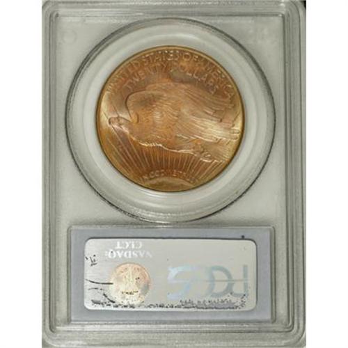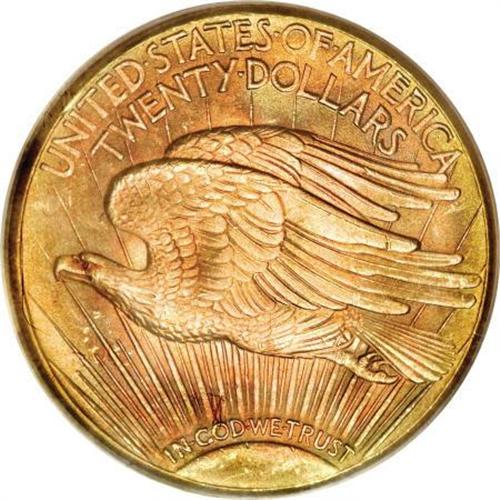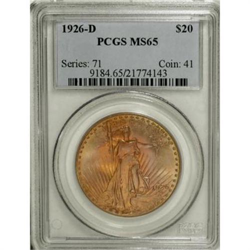 <B>1926-D $20 MS65 PCGS.</B></I> This is a simply spectacular coin both from technical and aesthetic points of view. <BR> Despite an initial mintage of 481,000 examples, the vast majority of the entire mintage was destroyed during the great gold melts of the 1930s. Bowers calls the issue an "erstwhile former rarity, very rare today" and says succinctly in his <I>Guide Book of Double Eagle Gold Coins, </B></I>"Today the 1926-D is one of the key issues of the Saint-Gaudens series, with only a few hundred known to exist. Typical grades are MS-60 to MS-63. Gems are rare. Today the 1926-D double remains very elusive, though hardly in the 'impossible' category. Most were probably retained in the United States and melted in the mid-1930s."<BR> Bowers notes further that specimens usually show some areas of lightness, such as the Capitol dome, and that many different die states result from the many die pairs used to produce the coinage.<BR> In <I>The Coinage of Augustus Saint-Gaudens as Illustrated by the Collection of Phillip H. Morse, </B></I>the authors note that "from the scant number of survivors today, it appears that most of these were retained in the United States and subsequently melted ... . Apparently none were sent overseas, as no hoards or significant accumulations have been discovered in the past 50 years. It is interesting to note that along with the 1924-S, the 1926-D used to be considered one of the two rarest Saint-Gaudens double eagles. In the 1940s, both of these dates were considered even rarer than the 1927-D, an issue now considered the classic rarity of the collection."<BR> Unlike many issues in the series that are former rarities now dethroned, the 1926-D remains a key issue today<I>. The Coinage of Augustus Saint-Gaudens</B></I> authors write, "With respect to overall rarity, the 1926-D is virtually identical to the 1925-S, except it is most often found in Uncirculated grades, while the 1925-S is usually found circulated. [The 1926-D] is one of the scarcest and most underrated issues in the series, and when available, it is usually seen in MS60-MS63 at best. Current population figures bear this out with about 250 examples (High R.3) certified in MS63 or lesser grades, while MS64 and finer pieces number just a couple of dozen (Low R.6).<BR> "The Phillip Morse Collection contained only one piece, that being an exceedingly rare PCGS MS66. ... According to Akers (1988), he had never seen ANY collection of Saint-Gaudens twenties that contained Gem examples of the 1924-S, 1925-S, and 1926-D. These three dates are considered the condition standards of the set ... ."<BR> As we said earlier, this is a simply spectacular coin, a no-questions Gem, and one that would certainly go a long way toward setting the "condition standard" for a similar set in the future. For a gold coin the toning is remarkably bold and persuasive, with central areas of sunset-orange on each side melding into sage, violet, and mint-green toward the peripheries. (Such unusual toning on a gold coin can occur when there is an unusually high proportion of copper alloy near the surface of the coin, which is much more reactive than the gold.) The strike is bold, aside from the aforementioned area of the Capitol dome and Liberty's right (facing) foot. Exuberant cartwheel luster emanates powerfully from both sides, unimpeded by the lovely color. There are remarkably few abrasions noted, save for a single pedigree identifier beneath Liberty's hair in the left obverse field and a patch of small, thin scrapes on her torso. PCGS Population: 5 in 65, 2 finer (12/07). None finer than MS64 at NGC.<BR><I>From The Jacob Collection of Saint-Gaudens Double Eagles.</B></I><BR><BR><B>Coin Engraver:</B> Augustus Saint-Gaudens<BR><BR><b>Shipping:</b> Coins & Currency (<a target="_blank" href="http://www.heritageauctions.com/common/shipping.php">view shipping information</a>)
