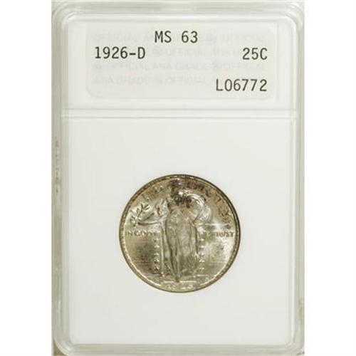 <B>1926-D 25C MS63 ANACS.</B></I> NGC Census: (465/1058). PCGS Population (1055/1327). Mintage: 1,716,000. Numismedia Wsl. Price for NGC/PCGS coin in MS63: $188. (#5756)<BR><BR><B>Coin Engraver:</B> Hermon A. MacNeil<BR><BR><b>Shipping:</b> Coins & Currency (<a target="_blank" href="http://www.heritageauctions.com/common/shipping.php">view shipping information</a>)