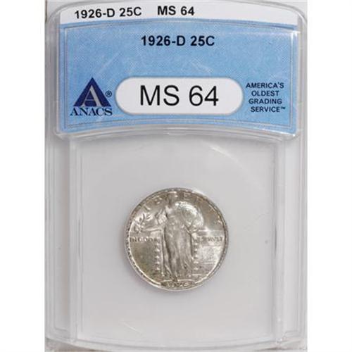 <B>1926-D 25C MS64 ANACS.</B></I> NGC Census: (819/239). PCGS Population (1161/157). Mintage: 1,716,000. Numismedia Wsl. Price for NGC/PCGS coin in MS64: $252. (#5756)<BR><BR><B>Coin Engraver:</B> Hermon A. MacNeil<BR><BR><b>Shipping:</b> Coins & Currency (<a target="_blank" href="http://www.heritageauctions.com/common/shipping.php">view shipping information</a>\)