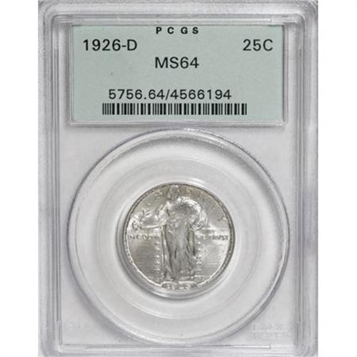<B>1926-D 25C MS64 PCGS.</B></I> PCGS Population (1183/167). NGC Census: (827/239). Mintage: 1,716,000. Numismedia Wsl. Price for NGC/PCGS coin in MS64: $275. (#5756)<BR><BR><B>Coin Engraver:</B> Hermon A. MacNeil<BR><BR><b>Shipping:</b> Coins & Currency (<a target="_blank" href="http://www.heritageauctions.com/common/shipping.php">view shipping information</a>)