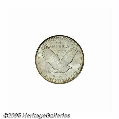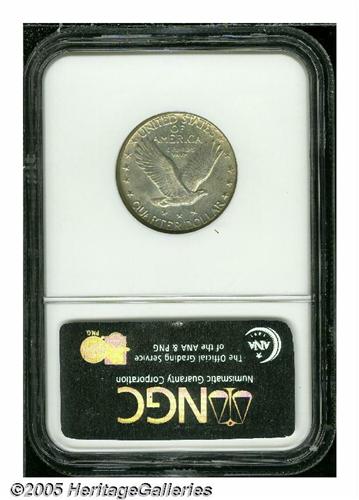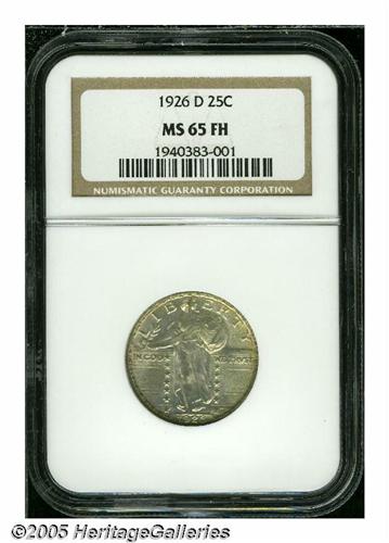 <B>1926-D<25C> MS65 Full Head NGC.</B></I> Only 1.7 million pieces were struck of the 1926-D Standing Liberty Quarter, and examples with Full Head definition are very elusive. This is a pleasing, satiny coin that suffers minimally from post-striking defects, and both obverse and reverse are covered with light, even golden-gray toning. Conditionally elusive, and virtually unobtainable any finer. Population: 5 in 65, 2 finer (6/05).