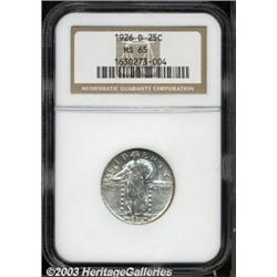 1926-D 25C MS65 NGC. Frosty-white surfaces are a trifle mushy on the highpoints, but still well above average for this famously ill-defined issue. Important notice: Heritage usually auctions material at the rate of 200-250 lots per hour. On some occasions eBay Live bid software or the Internet may not be able to keep up with the pace of the auction. We recommend placing a realistic absentee bid now as insurance to avoid disappointment. Occasionally the auctioneer may eliminate or reject an eBay Live bid, and the auctioneer may also reopen a lot after the close of the eBay live bidding (usually because we missed an audience bid), and may reject your bid even if it shows you as the winning bidder. By bidding via eBay Live, you agree that Heritage may award the lot to another bidder at its sole discretion under the circumstances described above or any other reasonable circumstances. Also please note that all Heritage lots purchased through eBay Live carry a 20% Buyer's Premium. Please make sure you read the Terms and Conditions before you bid.