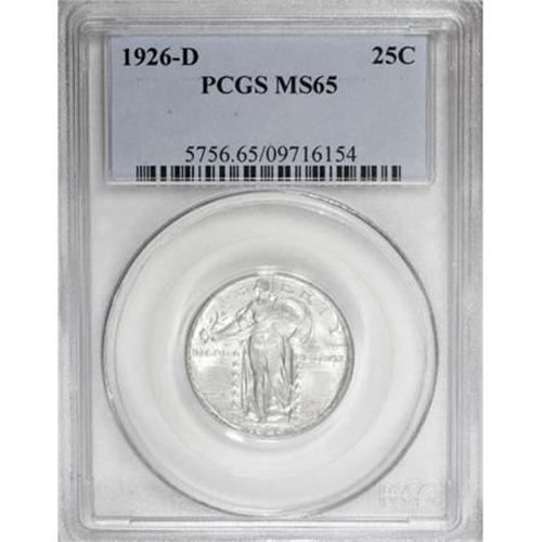 <B>1926-D 25C MS65 PCGS.</B></I> PCGS Population (155/9). NGC Census: (224/14). Mintage: 1,716,000. Numismedia Wsl. Price for NGC/PCGS coin in MS65: $452. (#5756)<BR><BR><B>Coin Engraver:</B> Hermon A. MacNeil<BR><BR><b>Shipping:</b> Coins & Currency (<a target="_blank" href="http://www.heritageauctions.com/common/shipping.php">view shipping information</a>)