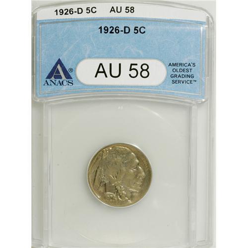 <B>1926-D 5C AU58 ANACS.</B></I> NGC Census: (23/427). PCGS Population (25/773). Mintage: 5,638,000. Numismedia Wsl. Price: $242. (#3958)<BR><BR><b>Shipping:</b> Coins & Currency (<a target="_blank" href="http://www.heritageauctions.com/common/shipping.php">view shipping information</a>)