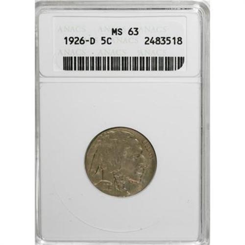 <B>1926-D 5C MS63 ANACS.</B></I> NGC Census: (147/131). PCGS Population (346/262). Mintage: 5,638,000. Numismedia Wsl. Price for NGC/PCGS coin in MS63: $410. (#3958)<BR><BR><B>Coin Engraver:</B> James E. Fraser<BR><BR><b>Shipping:</b> Coins & Currency (<a target="_blank" href="http://www.heritageauctions.com/common/shipping.php">view shipping information</a>)