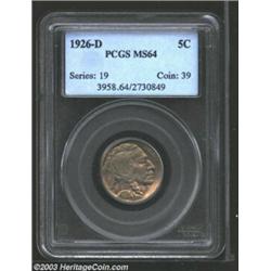 <TR><TD width="100%"><TABLE cellSpacing=1 cellPadding=3 width="100%" border=0><TBODY><TR><TD width="100%" bgColor=#79735c><FONT face=arial color=#ffffff size=3><B>Description</B> </FONT></TD></TR><TR><TD width="100%" bgColor=#ffffff><FONT face=arial size=2><B>1926-D 5C MS64 PCGS.</B></I> Typically struck and nearly mark-free, with notable prooflike luster remaining in the protected regions. </FONT></TD></TR></TBODY></TABLE></TD></TR></TBODY></TABLE><BR><A name=PricesRealized></A><TABLE cellSpacing=0 cellPadding=0 width="100%" bgColor=#000000 border=0><TBODY><TR><TD width="100%"><TABLE cellSpacing=1 cellPadding=3 width="100%" border=0><TBODY><TR><TD width="100%" bgColor=#79735c><A name=PR><FONT face=arial color=#ffffff size=3><B>Previous Prices from Heritage Auctions</B> </FONT></A></TD></TR><TR><TD bgColor=#f6f6ed><TABLE cellSpacing=0 cellPadding=0 width="100%" border=1><TBODY><TR><TD align=middle width="33%"><B>Date</B></TD><TD align=middle width="33%"><B>Service</B></TD><TD align=middle width="33%"><B>Price</B></TD></TR><TR bgColor=whitesmoke><TD width="33%"><B>01/09/2001</B></TD><TD width="33%">PCGS</TD><TD width="33%">$1,050.00</TD></TR><TR bgColor=whitesmoke><TD width="33%"><B>08/17/1996</B></TD><TD width="33%">PCGS</TD><TD width="33%">$1,540.00</TD></TR><TR bgColor=whitesmoke><TD width="33%"><B>02/01/1999</B></TD><TD width="33%">PCGS</TD><TD width="33%">$1,553.00</TD></TR><TR bgColor=whitesmoke><TD width="33%"><B>09/01/1995</B></TD><TD width="33%">PCGS</TD><TD width="33%">$2,310.00</TD></TR><TR bgColor=whitesmoke><TD width="33%"><B>05/27/2001</B></TD><TD width="33%">PCGS</TD><TD width="33%">$2,990.00</TD></TR><TR bgColor=whitesmoke><TD width="33%"><B>03/01/2001</B></TD><TD width="33%">PCGS</TD><TD width="33%">$1,783.00</TD></TR><TR bgColor=whitesmoke><TD width="33%"><B>04/27/2002</B></TD><TD width="33%">PCGS</TD><TD width="33%">$2,185.00</TD></TR><TR bgColor=whitesmoke><TD width="33%"><B>03/01/2003</B></TD><TD width="33%">NGC</TD><TD width="33%">$776.25</TD></TR><TR bgColor=whitesmoke><TD width="33%"><B>07/30/2002</B></TD><TD width="33%">ANACS</TD><TD width="33%">$920.00</TD></TR></TBODY></TABLE></TD></TR><TR><TD bgColor=#ffffff><FONT face=arial size=1 ?>PLEASE NOTE: All prices realized reflect the final hammer price PLUS the buyer's premium in auctions that charge a buyer's premium. Each item has a notation at the top of the listing indicating whether that lot included a buyer's premium. Example: A item that sells with a final hammer price of $100 and a 20% buyer's premium will display with a price realized of $120. All information listed is intended to be as accurate as possible, but errors are possible. Please use this guide carefully and inform us of any inaccuracies. </FONT></TD></TR></TBODY></TABLE></TD></TR></TBODY></TABLE><BR><TABLE cellSpacing=0 cellPadding=0 width="100%" bgColor=#000000 border=0><TBODY><TR><TD width="100%"><TABLE cellSpacing=1 cellPadding=3 width="100%" border=0><TBODY><TR><TD width="100%" bgColor=#79735c colSpan=6><FONT face=arial color=#ffffff size=3><B>Price Guide*</B> </FONT></TD></TR><TR bgColor=#f6f6ed><TD align=middle><B>Grade</B> </TD><TD align=middle><B>Coin World<BR>(Trends)</B> </TD><TD align=middle><B>Numismedia<BR>Retail</B> </TD><TD align=middle><B>Numismedia<BR>Wholesale</B> </TD><TD align=middle><B>Coin<BR>Universe</B> </TD><TD align=middle><B>Heritage<BR>Value Index</B> </TD></TR><TR bgColor=#ffffff><TD align=middle>63</TD><TD align=right>$475.00</TD><TD align=right>$450.00</TD><TD align=right>$375.00</TD><TD align=right>$475.00</TD><TD align=right>$352.25</TD></TR><TR style="FONT-WEIGHT: bold" bgColor=#cccfdd><TD align=middle>64</TD><TD align=right>$1,450.00</TD><TD align=right>---</TD><TD align=right>$1,250.00</TD><TD align=right>$1,675.00</TD><TD align=right>$1,074.88</TD></TR><TR bgColor=#ffffff><TD align=middle>65</TD><TD align=right>$5,000.00</TD><TD align=right>---</TD><TD align=right>$3,975.00</TD><TD align=right>$5,750.00</TD><TD align=right>$3,546.38</TD></TR><TR bgColor=#ffffff><TD colSpan=6><FONT size=1>*All information listed is intended to be as accurate as possible, but errors are possible. No item may be returned or refused based on this information which is provided as a service to our customers. You should contact each pricing source directly to determine the accuracy of this information. </FONT></TD></TR></TBODY></TABLE></TD></TR></TBODY></TABLE><BR><TABLE cellSpacing=0 cellPadding=0 width="100%" bgColor=#000000 border=0><TBODY><TR><TD width="100%"><TABLE cellSpacing=1 cellPadding=3 width="100%" border=0><TBODY><TR><TD width="100%" bgColor=#79735c><FONT face=arial color=#ffffff size=3><B>Population Guide</B> </FONT></TD></TR><TR bgColor=#ffffff><TD align=middle><!-- Begin Output of Population Grid--><TABLE cellSpacing=0 cellPadding=0 width="100%" border=0><TBODY><TR><TD vAlign=center><TABLE cellSpacing=0 width="100%" border=1 cellsadding="3"><TBODY><TR><TD vAlign=center><TABLE cellSpacing=0 cellPadding=3 width="100%" border=1><TBODY><TR><TD vAlign=center align=middle bgColor=#f0f1e8 colSpan=2 <CENTER><FONT face=Arial size=2><B>PCGS Pop </B></FONT><CENTER></CENTER></TD><TD vAlign=center align=middle bgColor=#f0f1e8 colSpan=2><CENTER><FONT face=Arial size=2><B>NGC Pop</B></CENTER></FONT></TD></TR><TR><TD vAlign=center><FONT face=Arial size=2>(64)</FONT> </TD><TD vAlign=center align=right><FONT face=Arial size=2>125</FONT> </TD><TD vAlign=center><FONT face=Arial size=2>(64)</FONT> </TD><TD vAlign=center align=right><FONT face=Arial size=2>82</FONT> </TD></TR><TR><TD vAlign=center><FONT face=Arial size=2>(>64)</FONT> </TD><TD vAlign=center align=right><FONT face=Arial size=2>84</FONT> </TD><TD vAlign=center><FONT face=Arial size=2>(>64)</FONT> </TD><TD vAlign=center align=right><FONT face=Arial size=2>26</FONT> </TD></TR></TBODY></TABLE></TD></TR></TBODY></TABLE></TD></TR></TBODY></TABLE><!-- End Output of Population Grid--></TD></TR></TBODY></TABLE></TD></TR></TBODY></TABLE><BR><TABLE cellSpacing=0 cellPadding=0 width="100