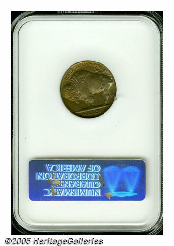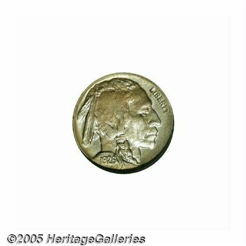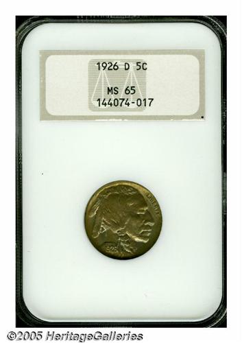 <B>1926-D<5C> MS65 NGC.</B></I> While not an absolute rarity in all grades, like the 1926-S, the 1926-D is one of the better known strike rarities in the series. Many coins are clean and lustrous but are so weakly struck that they are undesirable to collectors. While this piece is not fully defined, it certainly has sufficient details to hold its own in any set of MS65 Buffalo Nickels. Each side shows moderate blue-gray and reddish-golden toning with a strong presence of underlying mint frost. Population: 20 in 65, 7 finer (6/05).