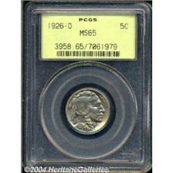 <table><tbody><tr><td><table> <TR><TD width="100%"><TABLE cellSpacing=1 cellPadding=3 width="100%" border=0><TBODY><TR><TD width="100%" bgColor=#79735c><FONT face=arial color=#ffffff size=3><B>Description</B> </FONT></TD></TR><TR><TD width="100%" bgColor=#ffffff><FONT face=arial size=2><B>1926-D 5C MS65 PCGS.</B></I> The 1926-D is in among the top six strike rarities in the Buffalo nickel series. Many high grade examples are so weakly struck that they are undesirable to collectors. Not so with this piece. The striking details are just a tiny bit short of full strike status and well balanced in strength on each side. The surfaces are bright and satiny with light, even golden toning over both obverse and deeper reddish tinged golden coloration on the reverse. Population: 69 in 65, 17 finer (10/03). </FONT></TD></TR></TBODY></TABLE></TD></TR></TBODY></TABLE><BR><A name=PricesRealized></A><TABLE cellSpacing=0 cellPadding=0 width="100%" bgColor=#000000 border=0><TBODY><TR><TD width="100%"><TABLE cellSpacing=1 cellPadding=3 width="100%" border=0><TBODY><TR><TD width="100%" bgColor=#79735c><A name=PR><FONT face=arial color=#ffffff size=3><B>Previous Prices from Heritage Auctions</B> </FONT></A></TD></TR><TR><TD bgColor=#f6f6ed><TABLE cellSpacing=0 cellPadding=0 width="100%" border=1><TBODY><TR><TD align=middle width="33%"><B>Date</B></TD><TD align=middle width="33%"><B>Service</B></TD><TD align=middle width="33%"><B>Price</B></TD></TR><TR bgColor=whitesmoke><TD width="33%"><B>11/20/2001</B></TD><TD width="33%">PCGS</TD><TD width="33%">$3,200.00</TD></TR><TR bgColor=whitesmoke><TD width="33%"><B>09/20/2003</B></TD><TD width="33%">PCGS</TD><TD width="33%">$4,025.00</TD></TR><TR bgColor=whitesmoke><TD width="33%"><B>05/03/2003</B></TD><TD width="33%">PCGS</TD><TD width="33%">$4,082.50</TD></TR><TR bgColor=whitesmoke><TD width="33%"><B>03/01/2003</B></TD><TD width="33%">NGC</TD><TD width="33%">$3,680.00</TD></TR><TR bgColor=whitesmoke><TD width="33%"><B>09/28/2002</B></TD><TD width="33%">PCGS</TD><TD width="33%">$4,197.50</TD></TR><TR bgColor=whitesmoke><TD width="33%"><B>10/06/2001</B></TD><TD width="33%">PCGS</TD><TD width="33%">$2,990.00</TD></TR><TR bgColor=whitesmoke><TD width="33%"><B>04/05/2001</B></TD><TD width="33%">PCGS</TD><TD width="33%">$3,450.00</TD></TR><TR bgColor=whitesmoke><TD width="33%"><B>08/07/1998</B></TD><TD width="33%">PCGS</TD><TD width="33%">$2,702.50</TD></TR><TR bgColor=whitesmoke><TD width="33%"><B>08/17/1996</B></TD><TD width="33%">PCGS</TD><TD width="33%">$2,310.00</TD></TR><TR bgColor=whitesmoke><TD width="33%"><B>08/13/1996</B></TD><TD width="33%">NGC</TD><TD width="33%">$2,090.00</TD></TR><TR bgColor=whitesmoke><TD width="33%"><B>01/06/1996</B></TD><TD width="33%">PCGS</TD><TD width="33%">$2,640.00</TD></TR><TR bgColor=whitesmoke><TD width="33%"><B>08/19/1995</B></TD><TD width="33%">PCGS</TD><TD width="33%">$2,530.00</TD></TR><TR bgColor=whitesmoke><TD width="33%"><B>08/01/1999</B></TD><TD width="33%">PCGS</TD><TD width="33%">$2,530.00</TD></TR><TR bgColor=whitesmoke><TD width="33%"><B>09/01/1997</B></TD><TD width="33%">PCGS</TD><TD width="33%">$1,870.00</TD></TR><TR bgColor=whitesmoke><TD width="33%"><B>01/01/2000</B></TD><TD width="33%">PCGS</TD><TD width="33%">$2,530.00</TD></TR></TBODY></TABLE></TD></TR><TR><TD bgColor=#ffffff><FONT face=arial size=1 ?>PLEASE NOTE: All prices realized reflect the final hammer price PLUS the buyer's premium in auctions that charge a buyer's premium. Each item has a notation at the top of the listing indicating whether that lot included a buyer's premium. Example: A item that sells with a final hammer price of $100 and a 20% buyer's premium will display with a price realized of $120. All information listed is intended to be as accurate as possible, but errors are possible. Please use this guide carefully and inform us of any inaccuracies. </FONT></TD></TR></TBODY></TABLE></TD></TR></TBODY></TABLE><BR><TABLE cellSpacing=0 cellPadding=0 width="100%" bgColor=#000000 border=0><TBODY><TR><TD width="100%"><TABLE cellSpacing=1 cellPadding=3 width="100%" border=0><TBODY><TR><TD width="100%" bgColor=#79735c colSpan=6><FONT face=arial color=#ffffff size=3><B>Price Guide*</B> </FONT></TD></TR><TR bgColor=#f6f6ed><TD align=middle><B>Grade</B> </TD><TD align=middle><B>Coin World<BR>(Trends)</B> </TD><TD align=middle><B>Numismedia<BR>Retail</B> </TD><TD align=middle><B>Numismedia<BR>Wholesale</B> </TD><TD align=middle><B>Coin<BR>Universe</B> </TD><TD align=middle><B>Heritage<BR>Value Index</B> </TD></TR><TR bgColor=#ffffff><TD align=middle>64</TD><TD align=right>$1,500.00</TD><TD align=right>---</TD><TD align=right>$1,250.00</TD><TD align=right>$1,675.00</TD><TD align=right>$1,136.13</TD></TR><TR style="FONT-WEIGHT: bold" bgColor=#cccfdd><TD align=middle>65</TD><TD align=right>$5,000.00</TD><TD align=right>---</TD><TD align=right>$4,100.00</TD><TD align=right>$5,750.00</TD><TD align=right>$3,661.83</TD></TR><TR bgColor=#ffffff><TD align=middle>66</TD><TD align=right>$11,000.00</TD><TD align=right>---</TD><TD align=right>$7,875.00</TD><TD align=right>$13,500.00</TD><TD align=right>$8,575.00</TD></TR><TR bgColor=#ffffff><TD colSpan=6><FONT size=1>*All information listed is intended to be as accurate as possible, but errors are possible. No item may be returned or refused based on this information which is provided as a service to our customers. You should contact each pricing source directly to determine the accuracy of this information. </FONT></TD></TR></TBODY></TABLE></TD></TR></TBODY></TABLE><BR><TABLE cellSpacing=0 cellPadding=0 width="100%" bgColor=#000000 border=0><TBODY><TR><TD width="100%"><TABLE cellSpacing=1 cellPadding=3 width="100%" border=0><TBODY><TR><TD width="100%" bgColor=#79735c><FONT face=arial color=#ffffff size=3><B>Population Guide</B> </FONT></TD></TR><TR bgColor=#ffffff><TD align=middle><!-- Begin Output of Population Grid--><TABLE cellSpacing=0 cellPadding=0 width="100%" border=0><TBODY><TR><TD vAlign=center><TABLE cel