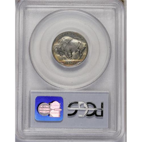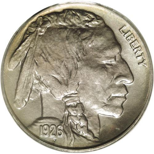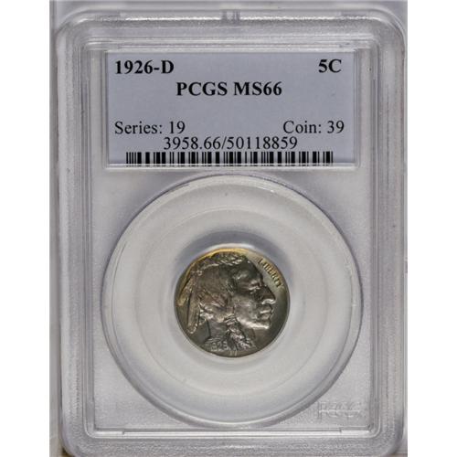 <B>1926-D<5C> MS66 PCGS.</B></I> The Denver and San Francisco Mint issues from the mid-twenties are generally found with poor design details, when they are found in Mint State grades at all. This Gem example is one of the sharpest we have seen, regardless of numerical grade. With the exception of the immediate central design elements on each side, every detail is fully defined, including the split in the bison's tail. Only the wooly coat at the top of the front leg exhibits any weakness of design. This example, which essentially represents the finest available quality, has satiny luster and remarkable eye appeal. The surfaces have deep gray color with vivid gold, pale blue, and violet toning. Population: 18 in 66, 1 finer (6/06).