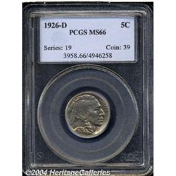 <B>1926-D<5C> MS66 PCGS.</B></I> While the 1926-D is not as rare in Mint State as the 1925-D, it is equally as difficult to find sharp. Both dates are strike rarities on par with such earlier branch mint issues as the 1919-D, 1919-S, and 1920-S. This lovely '26-D is not only boldly, if not sharply struck throughout, but it possesses smooth surfaces that are free of outwardly distracting blemishes. The full horn and split tail on the bison are particularly noteworthy, but shimmering mint luster is another feature that accounts for the superior technical quality. The originally preserved surfaces are awash in light-to-moderate reddish-golden patina. Population: 17 in 66, 1 finer (7/04). <BR><BR><B>Important notice:</B> Heritage usually auctions material at the rate of 200-250 lots per hour. On some occasions eBay Live bid software or the Internet may not be able to keep up with the pace of the auction. We recommend placing a realistic absentee bid now as insurance to avoid disappointment. Occasionally the auctioneer may eliminate or reject an eBay Live bid, and the auctioneer may also reopen a lot after the close of the eBay live bidding (usually because we missed an audience bid), and may reject your bid even if it shows you as the winning bidder. By bidding via eBay Live, you agree that Heritage may award the lot to another bidder at its sole discretion under the circumstances described above or any other reasonable circumstances. Since eBay bids are not shown to us until we open the lot on the floor, we treat those bids just like floor bids. In most cases the floor responds before the eBay bid is presented to us, due to Internet lag time, so for consistency we have made it a policy that floor bids are always considered first over tie eBay live bids. Also please note that all Heritage lots purchased through eBay Live carry a 20% Buyer's Premium. Please make sure you read the Terms and Conditions before you bid. </span></font></tr></table></td></tr></table>