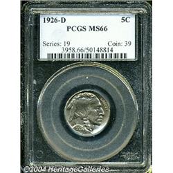 <B>1926-D<5C> MS66 PCGS.</B></I> This premium Gem is nicely defined for such a notoriously weak issue. The 1926-D is one of the six most difficult strike rarities in the Buffalo nickel series. Most of the coins known of this issue are so weakly struck that they appear undesirable to many collectors. However, this piece is very sharply defined with strong detail at the top of the bison's head and a faint split in the tail. The surfaces are clean and problem-free with smooth, satiny luster, and a light amount of rose-champagne color on the reverse. A superior example of this elusive issue. Population: 19 in 66, 1 finer (9/04). <BR><BR><B>Important notice:</B> Heritage usually auctions material at the rate of 200-250 lots per hour. On some occasions eBay Live bid software or the Internet may not be able to keep up with the pace of the auction. We recommend placing a realistic absentee bid now as insurance to avoid disappointment. Occasionally the auctioneer may eliminate or reject an eBay Live bid, and the auctioneer may also reopen a lot after the close of the eBay live bidding (usually because we missed an audience bid), and may reject your bid even if it shows you as the winning bidder. By bidding via eBay Live, you agree that Heritage may award the lot to another bidder at its sole discretion under the circumstances described above or any other reasonable circumstances. Since eBay bids are not shown to us until we open the lot on the floor, we treat those bids just like floor bids. In most cases the floor responds before the eBay bid is presented to us, due to Internet lag time, so for consistency we have made it a policy that floor bids are always considered first over tie eBay live bids. Also please note that all Heritage lots purchased through eBay Live carry a 20% Buyer's Premium. Please make sure you read the Terms and Conditions before you bid.