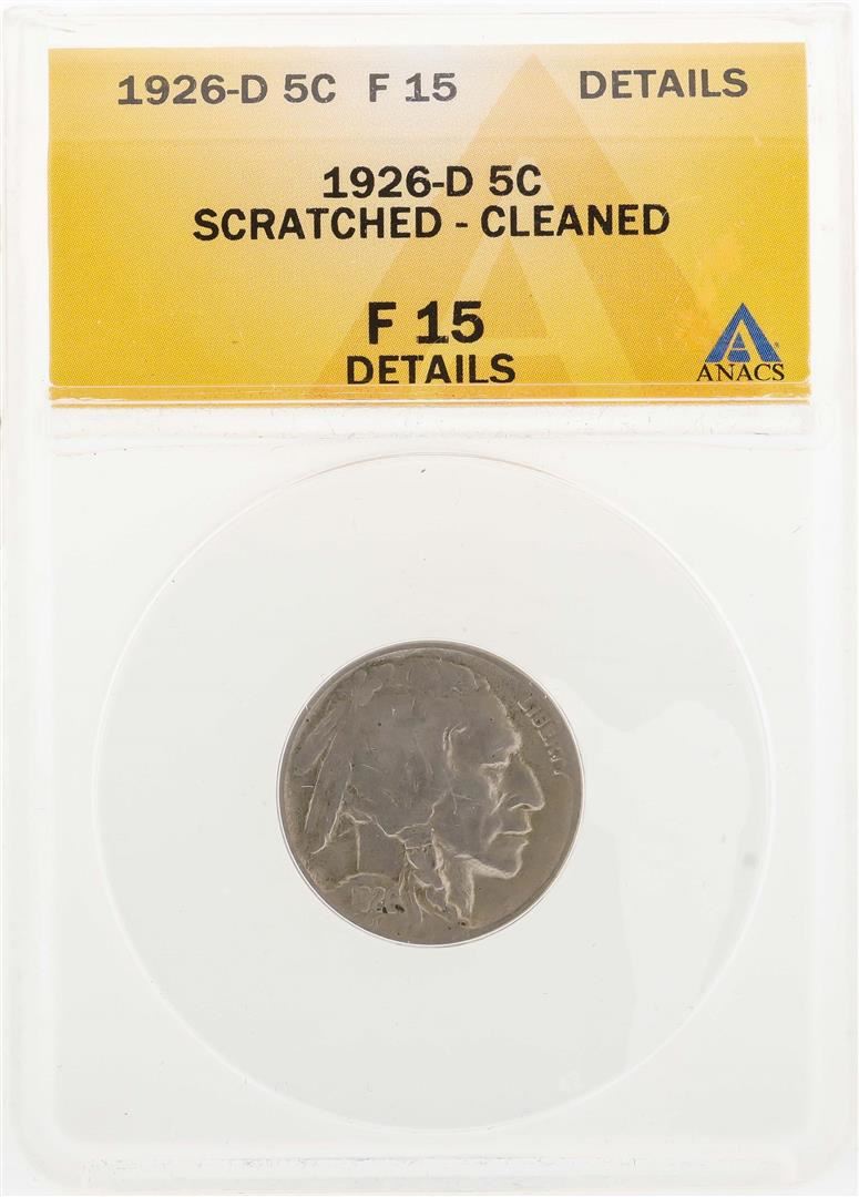 One 1926-D Buffalo Nickel Coin ANACS F15 Details Scratched Cleaned. ANACS Certified.