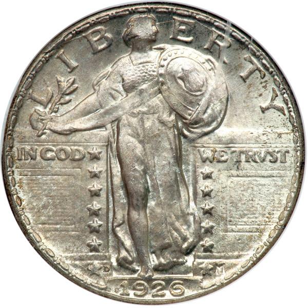 1926-D Liberty Standing Quarter Dollar. PCI graded MS-65. Our grade is MS-64, lightly toned on both sides with the normal flat head.