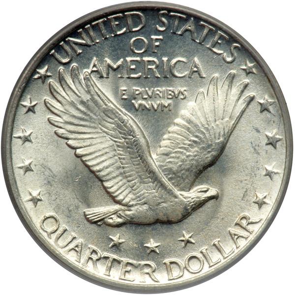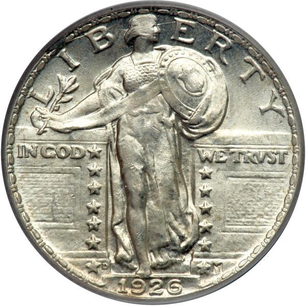 1926-D. PCGS graded MS-64. A pleasing white example with the head more than 50% full. In an OGH. In 1925 the date on the Standing Liberty quarters was recessed into the step, creating a sub-type. This allowed the coin's rim to protect the numbers better from wear. Evidently this modification did improve the situation, since pre-1925 dates fetch prices many times higher than post-1925 dates, even given roughly equal mintage numbers in the same state of preservation (PCGS # 5756) .
