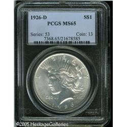 <B>1926-D<img border='0' src='http://www.heritagecoins.com/images/star.gif' width=10 height=10>$1 MS65 PCGS.</B></I> A few wisps of olive-gray toning are noted, especially on the obverse. The design features are well impressed, and a few light marks on Liberty's neck do not detract. Lot:10714