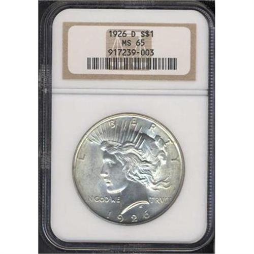 <b>1926-D Peace Dollar. NGC graded MS65.</b> Some minor irregularity at the obverse rim. This sparkling Gem boasts swirling cartwheel effects and uncommonly sharp striking pressure for a D-mint issue. Even the finest, most delicate detail seen on this coin struck with the sharp detail collectors are looking for <b>(PCGS # 7368)</b>