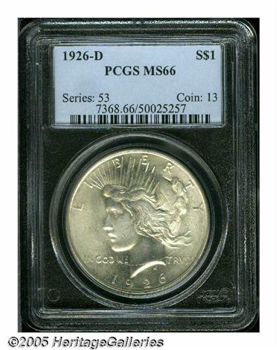 <B>1926-D<S$1> MS66 PCGS.</B></I> A radiant Premium Gem with characteristic sharpness over the central devices. A die crack across the base of Liberty's neck indicates an advanced die state and an unobtrusive planchet streak is confined mostly to the curls over her ear. A mere 13 pieces have been certified finer by PCGS and NGC combined (5/05).