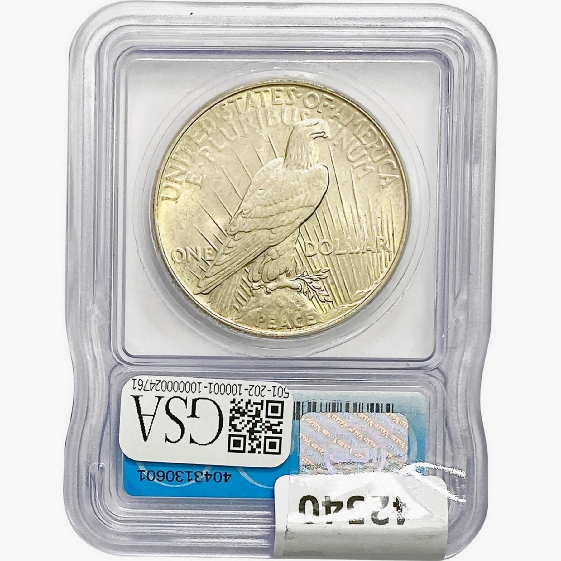 COINS AND CURRENCY LISTED IN GSA’S CATALOG AS GRADED AND ENCAPSULATED BY PCGS, NGC, ANACS, ICG, PCGS CURRENCY, PMG, PCGS BANKNOTE GRADING, CMC OR ANY OTHER THIRD-PARTY GRADING SERVICE ARE LIKEWISE SOLD “AS-IS” EXCEPT AS EXPRESSLY SET FORTH HEREIN. ALL THIRD-PARTY GRADING SERVICE GUARANTEES, INCLUDING AUTHENTICITY, ARE THE SOLE RESPONSIBILITY OF THE THIRD-PARTY GRADING SERVICE AND NOT WARRANTIES OR GUARANTEES OF GSA. BIDDERS SHOULD CONTACT THESE THIRD-PARTY GRADING SERVICES DIRECTLY WITH RESPECT TO ANY CLAIMS OR QUESTIONS THEY MAY HAVE CONCERNING THEIR GUARANTEES AND WARRANTIES. BIDDERS ACKNOWLEDGE AND AGREE THAT AUCTIONEER IS NOT BOUND BY OR LIABLE FOR ANY OPINION OR CERTIFICATION BY ANY THIRD-PARTY GRADING SERVICE. REMOVAL OF A PRODUCT FROM ITS PROTECTIVE CASING OR HOLDER OR ALTERATION OF ANY COIN HOLDER WAIVES ALL RIGHTS CONCERNING THE PRODUCT CONTAINED THEREIN.