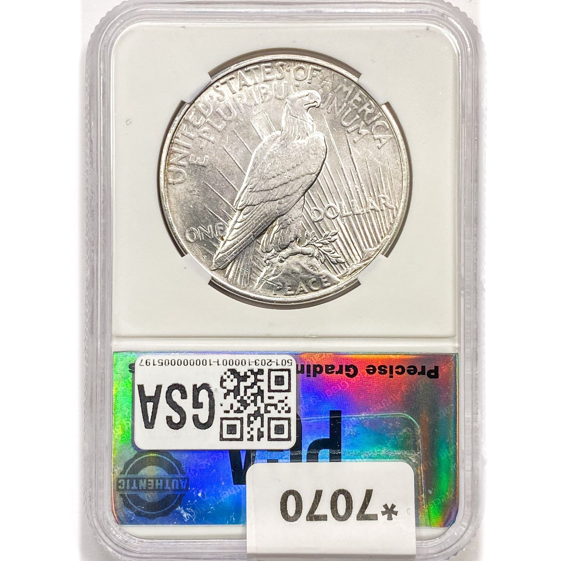 l. All non-certified coins and currency are guaranteed genuine, but are not guaranteed as to grade, since grading is a matter of opinion, an art and not a science, and therefore the description rendered by GSA or any third-party grading service may not agree with the opinion of others (including trained experts), and the same expert may not grade the same item with the same grade at two different times. GSA may, but is not obligated to, express an opinion as to non-certified numismatic items, in GSA’s opinion, or by its employees’ experience and the current interpretation of the American Numismatic Association’s standards as of the date the catalog was prepared. There is no guarantee or warranty expressed or implied that the grading opinions utilized by GSA, if any, will meet the standards of any grading service at any time in the future.