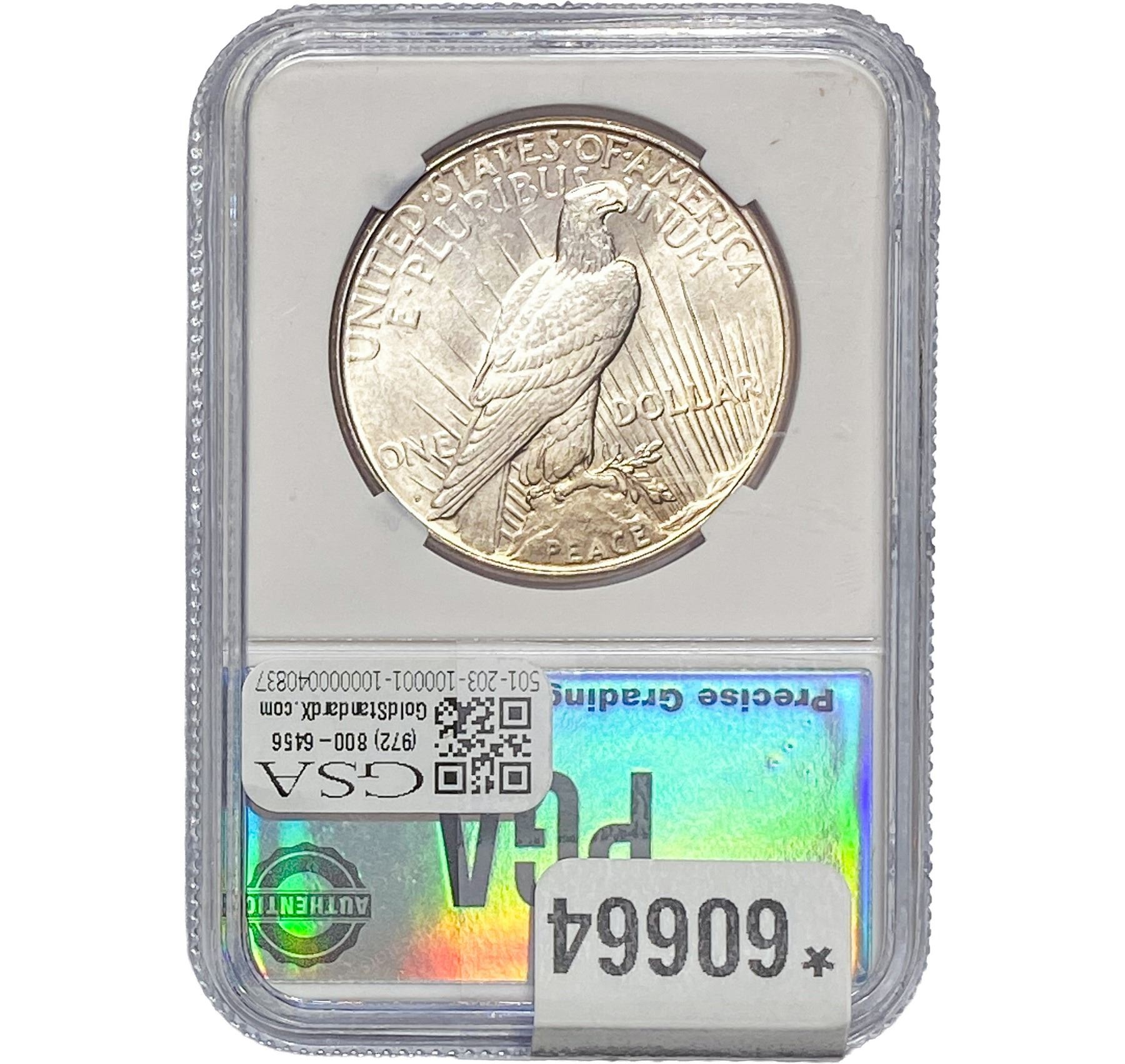 l. All non-certified coins and currency are guaranteed genuine, but are not guaranteed as to grade, since grading is a matter of opinion, an art and not a science, and therefore the description rendered by GSA or any third-party grading service may not agree with the opinion of others (including trained experts), and the same expert may not grade the same item with the same grade at two different times. GSA may, but is not obligated to, express an opinion as to non-certified numismatic items, in GSA’s opinion, or by its employees’ experience and the current interpretation of the American Numismatic Association’s standards as of the date the catalog was prepared. There is no guarantee or warranty expressed or implied that the grading opinions utilized by GSA, if any, will meet the standards of any grading service at any time in the future.