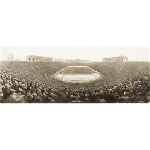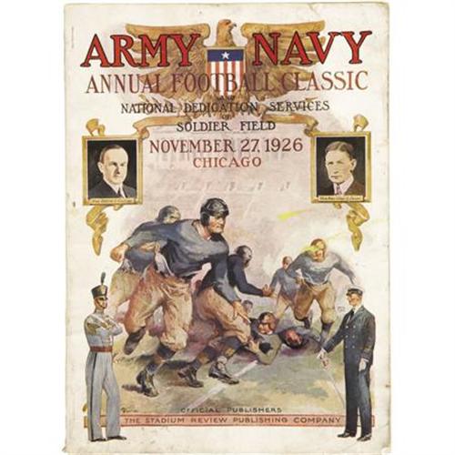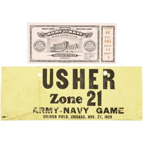 <B>1926 Dedication of Soldier Field Program, Ticket Stub, Usher's Armband and Panoramic Photograph.</B></I> Proving the popular maxim that war has no winners, two branches of the United States military battled to a twenty-one to twenty-one draw to christen the enormous new Chicago sporting palace on November 27, 1926. Offered here are several artifacts birthed by that historic draw. 1) Game program. Wear to covers and spine but complete and tightly bound, VG. 2) Ticket stub. Vertical crease near right edge, otherwise EX. 3) Usher's armband. Wear and some staining, VG. 4) Panoramic photograph. Measures 10.5x28". Tiny chip at right lower corner, and small tear at upper border, otherwise EX-MT. An impressive congregation of pieces from the debut of one of America's most esteemed sporting venues.<BR><BR><b>Shipping:</b> Miscellaneous Collectibles, Smal (<a target="_blank" href="http://www.heritageauctions.com/common/shipping.php">view shipping information</a>)