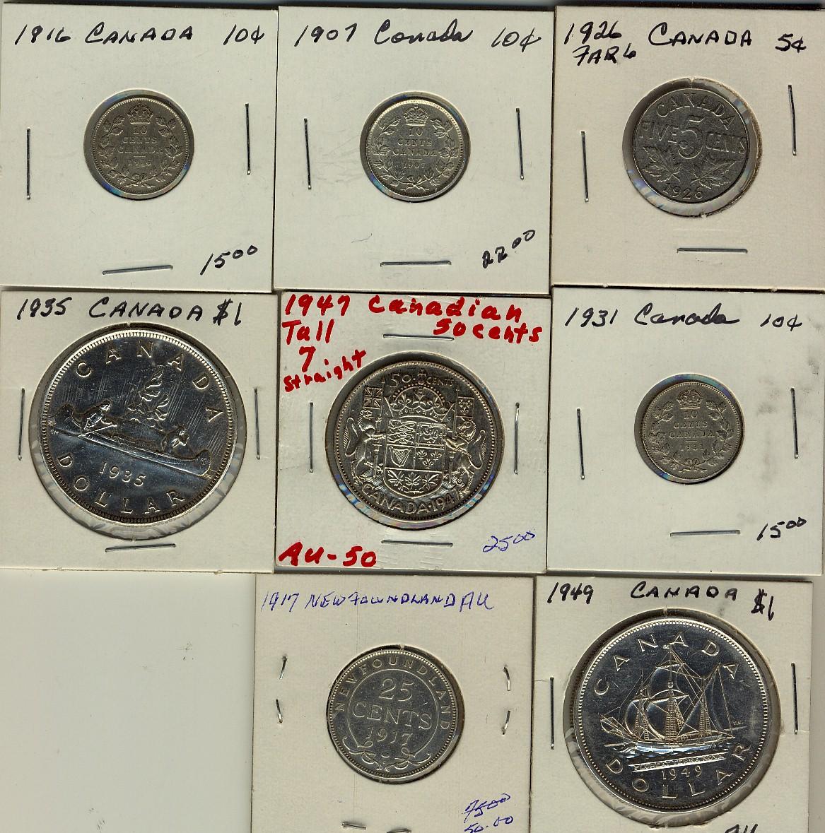 1926 Far 5¢ VG, 1907, 1916 & 1931 10¢ F-VF, 1947 St7 50¢ & 1935, 1939 $1 both EF. Also includes Nfl
