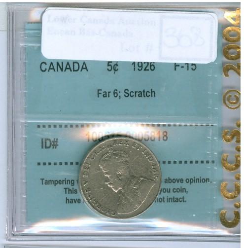 1926 Far 6 5¢ CCCS F-15; Scratch. Key date coin.