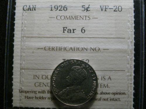 1926 Far 6 5¢ ICCS VF20, problem free.