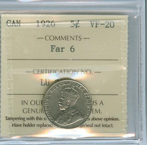 1926 Far 6 5¢ ICCS VF20, problem free.