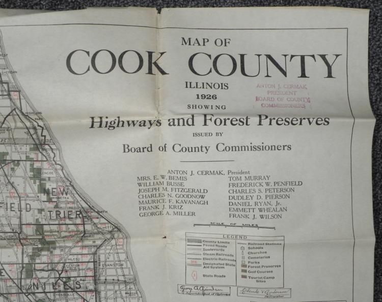 1926 MAP OF CHICAGO.S COOK COUNTY & SURROUNDING VILLAGES-ANTON CERMAK-STAMPEDGREAT ORIGINAL 1926 MAP OF CHICAGO AND EXISTING VILLAGES IN 1926. APPROX 28"X26"--STAMPED AND MARKED ANTON CERMAK-PRESIDENT