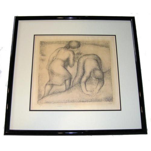 This important lithographic print by Aristide Maillol (1861-1944) was produced in 1926 and is known as Les Glaneuses or in English The Gleaners. (A gleaner gathers grain left behind by a reaper.) Matted and framed under glass. Excellent condition. Exposed print measures 13.5 x 13.5 inches and frame measures 20.25 x 20.25 inches. Signed in margin on left side " 31/75 " with the artist's monogram signature on the right. This work was purchased in 1951 from The Print Club in Philadelphia and is being sold here on behalf of the owner.