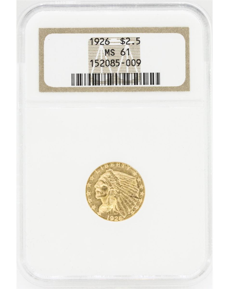 One 1926 NGC MS61 $2.50 Indian Head Quarter Eagle Gold Coin.
