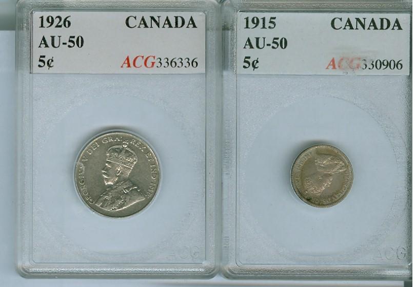 1926 Near 5¢ & 1915 10¢. Lot of 2 better date coins both ACG AU50. Should be viewed.