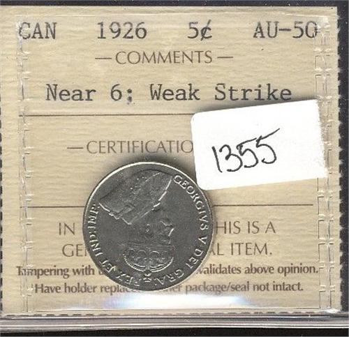 1926 Near 6 ICCS AU50 Brilliant with good lustre. A bit weakly struck!