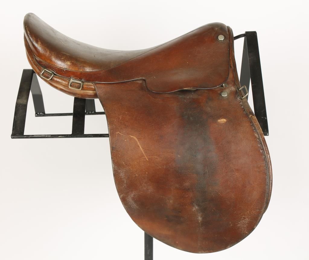 Without stirrups. In aged condition, cracks, tears, and damage to leather.
