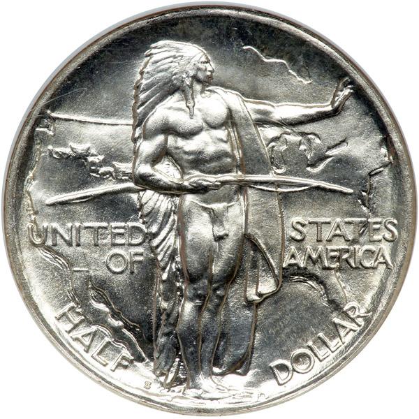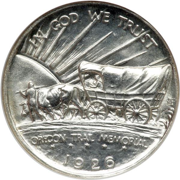 The coin was designed by James Earle and Laura Gardin Fraser. The obverse depicts a Conestoga wagon drawn by oxen heading into a setting sun. The motto IN GOD WE TRUST appears at the upper perimeter. Below the wagon it reads OREGON TRAIL MEMORIAL and the date. The designers' initials are behind the wagon. The reverse depicts an Indian standing erect with an outstretched arm as if to say, "Stop." The Indian is superimposed on a map of the United States showing a line of Conestoga wagons heading West. The inscription UNITED STATES OF AMERICA borders the Indian on the left and right. HALF DOLLAR appears on the lower perimeter. This coin was minted intermittantly from 1926-39 (PCGS # 9340) .