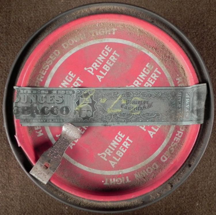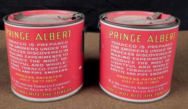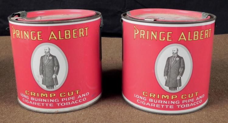 OFFERED HERE IS A PRINCE ALBERT CRIMP CUT LONG BURNING PIPE & CIGARETTE TOBACCO CANS; 1926 TAX SEALS. THEY ARE 5" IN DIAMETER & 5" TALL. * *