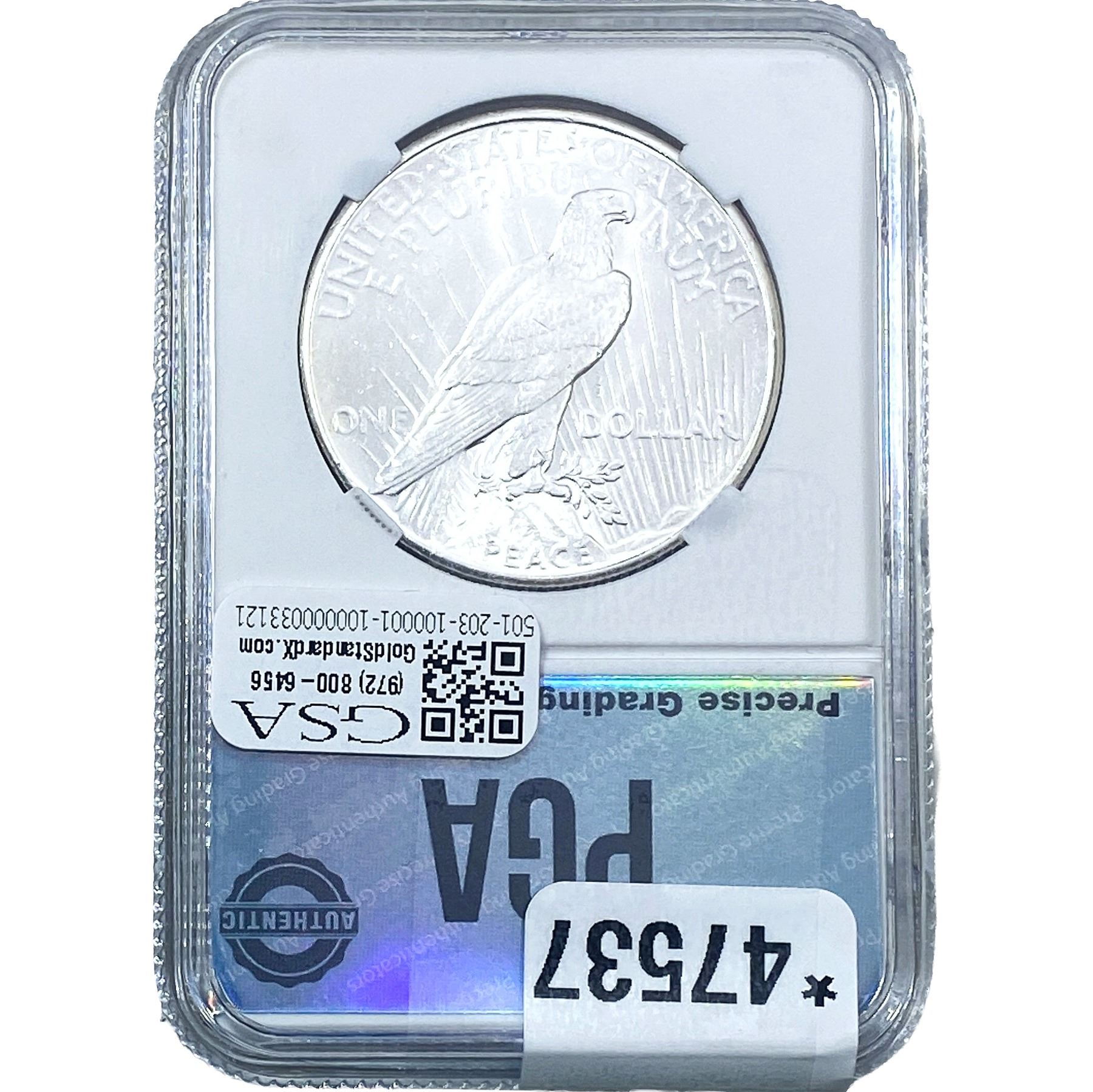 COINS AND CURRENCY LISTED IN GSA’S CATALOG AS GRADED AND ENCAPSULATED BY PCGS, NGC, ANACS, ICG, PCGS CURRENCY, PMG, PCGS BANKNOTE GRADING, CMC OR ANY OTHER THIRD-PARTY GRADING SERVICE ARE LIKEWISE SOLD “AS-IS” EXCEPT AS EXPRESSLY SET FORTH HEREIN. ALL THIRD-PARTY GRADING SERVICE GUARANTEES, INCLUDING AUTHENTICITY, ARE THE SOLE RESPONSIBILITY OF THE THIRD-PARTY GRADING SERVICE AND NOT WARRANTIES OR GUARANTEES OF GSA. BIDDERS SHOULD CONTACT THESE THIRD-PARTY GRADING SERVICES DIRECTLY WITH RESPECT TO ANY CLAIMS OR QUESTIONS THEY MAY HAVE CONCERNING THEIR GUARANTEES AND WARRANTIES. BIDDERS ACKNOWLEDGE AND AGREE THAT AUCTIONEER IS NOT BOUND BY OR LIABLE FOR ANY OPINION OR CERTIFICATION BY ANY THIRD-PARTY GRADING SERVICE. REMOVAL OF A PRODUCT FROM ITS PROTECTIVE CASING OR HOLDER OR ALTERATION OF ANY COIN HOLDER WAIVES ALL RIGHTS CONCERNING THE PRODUCT CONTAINED THEREIN.