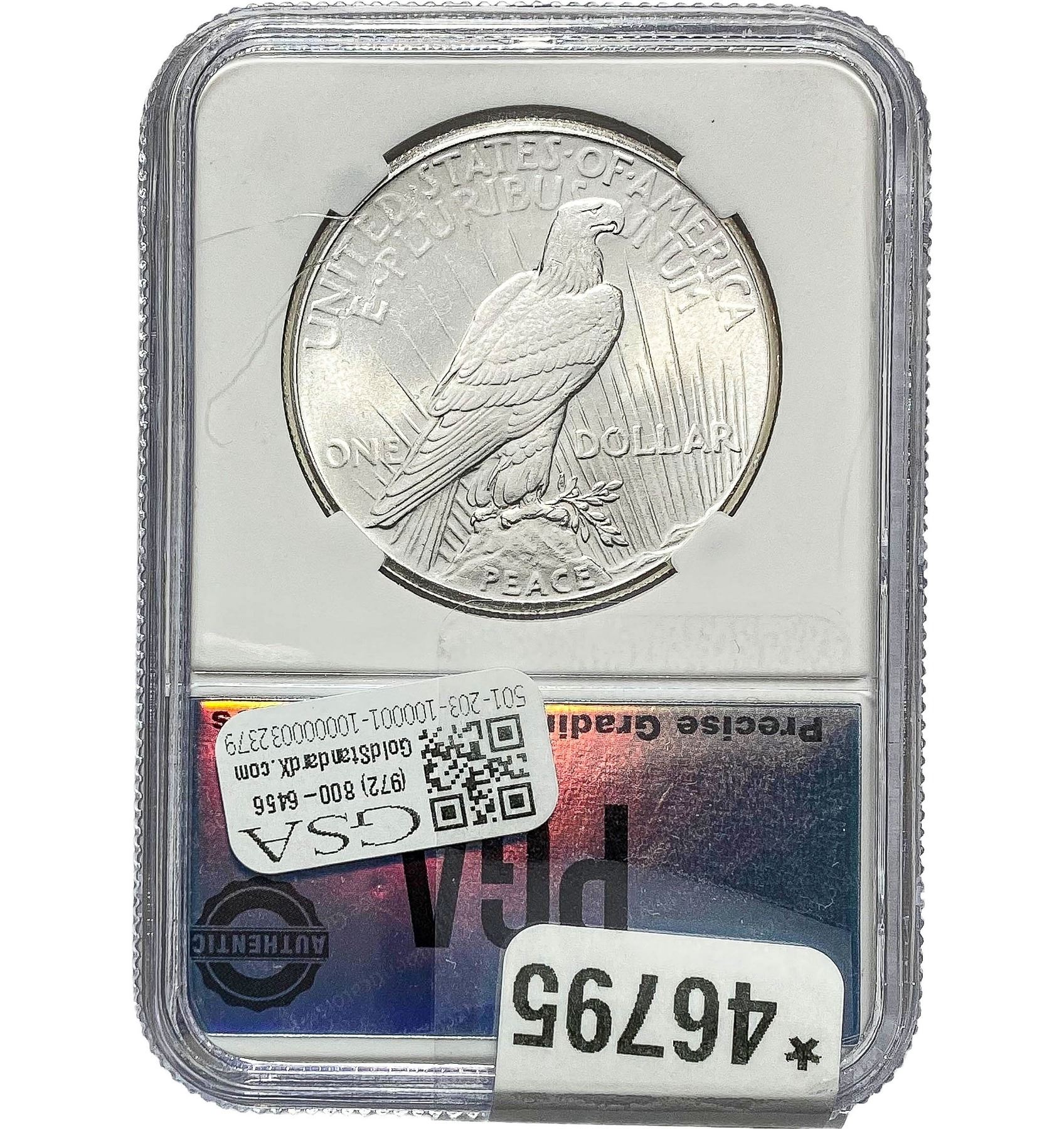 COINS AND CURRENCY LISTED IN GSA’S CATALOG AS GRADED AND ENCAPSULATED BY PCGS, NGC, ANACS, ICG, PCGS CURRENCY, PMG, PCGS BANKNOTE GRADING, CMC OR ANY OTHER THIRD-PARTY GRADING SERVICE ARE LIKEWISE SOLD “AS-IS” EXCEPT AS EXPRESSLY SET FORTH HEREIN. ALL THIRD-PARTY GRADING SERVICE GUARANTEES, INCLUDING AUTHENTICITY, ARE THE SOLE RESPONSIBILITY OF THE THIRD-PARTY GRADING SERVICE AND NOT WARRANTIES OR GUARANTEES OF GSA. BIDDERS SHOULD CONTACT THESE THIRD-PARTY GRADING SERVICES DIRECTLY WITH RESPECT TO ANY CLAIMS OR QUESTIONS THEY MAY HAVE CONCERNING THEIR GUARANTEES AND WARRANTIES. BIDDERS ACKNOWLEDGE AND AGREE THAT AUCTIONEER IS NOT BOUND BY OR LIABLE FOR ANY OPINION OR CERTIFICATION BY ANY THIRD-PARTY GRADING SERVICE. REMOVAL OF A PRODUCT FROM ITS PROTECTIVE CASING OR HOLDER OR ALTERATION OF ANY COIN HOLDER WAIVES ALL RIGHTS CONCERNING THE PRODUCT CONTAINED THEREIN.