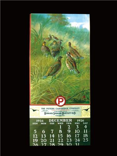 1926 Peters Cartridge Co. Calendar, G. Muss-Arnolt artist. Depicting a covey of quail. No band, December page only, some horizontal creases right side otherwise excellent original condition. Framed and matted. 13 1/2 X 29 inches.