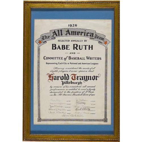 <B>1926 Pie Traynor All America Team Certificate Signed by Babe Ruth.</B></I> Could there be any greater honor for a Golden Age ballplayer than to be recognized by the legendary Babe Ruth as the best at your position? Surely Hall of Fame Pittsburgh Pirates third baseman Harold "Pie" Traynor was suitably honored by the presentation of this elegant scroll naming him as the cream of the 1926 crop. While these certificates do occasionally surface in the hobby, the Cooperstown credentials of the recipient in this case adds particular appeal. Signing off on the Babe's choice is a committee of sportswriters from each Big League city, with the tremendously desirable "Geo. H. 'Babe' Ruth" signature variation at bottom worth the price of admission alone. All autographs present at a strength of 9/10 or better, and the certificate itself offers no condition flaws to note. Measures 13x18" in size, with matting and framing extending the final dimensions to 17x25". Certificate was gifted to actor Max Gail, who appeared in the title role of the 1984 Broadway production "The Babe." A signed Playbill and poster from this production is included. <I>LOA from PSA/DNA. LOA from James Spence Authentication.</B></I><BR><BR><b>Shipping:</b> Flat Material, Small (<a target="_blank" href="http://www.heritageauctions.com/common/shipping.php">view shipping information</a>)