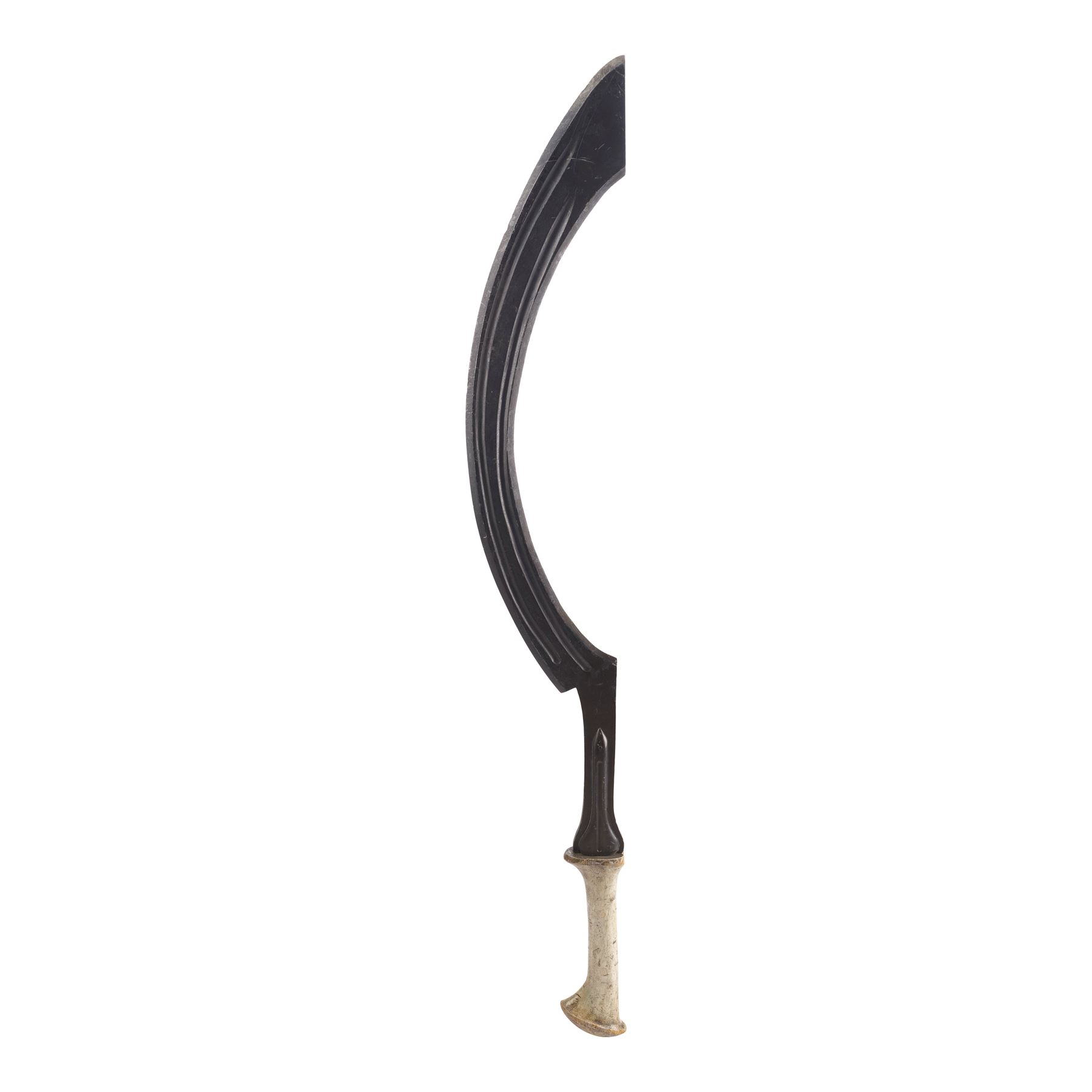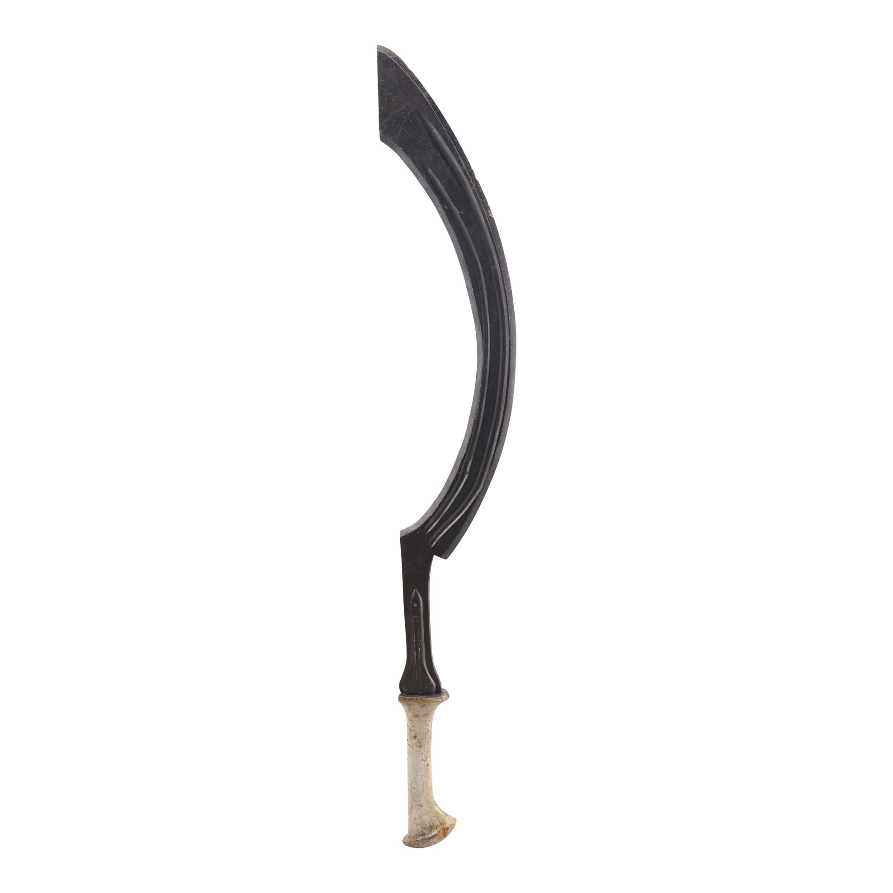 This khopesh features a curved fiberglass blade with two blood grooves down the sides and a dagger-shaped detail near its base mounted to a wooden handle carved and painted to resemble bone. The blade exhibits nicking and small fractures along its length, while the handle features a broken fragment near the base of the blade, paint flaking, and other small nicks. Dimensions: 55" x 10" x 3" (139.75 cm x 25.5 cm x 7.75 cm)