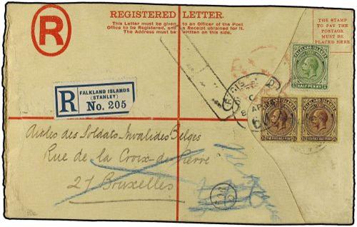 1926 Registered stationery envelope used t Brussels franked by 1921-29 ½ d. yellow green and pair of 2½ d. violet on yellow tied by Port Stanley cds and London transit. Brussels arrival (April 10) on reverse. Scott 41,45.