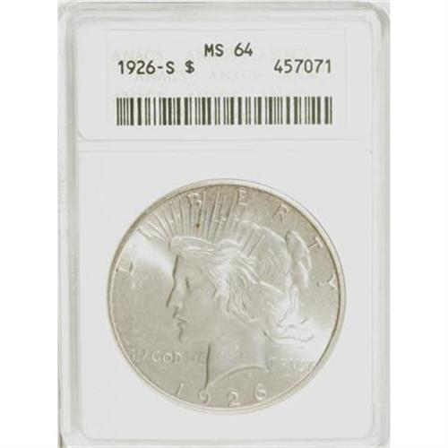 <B>1926-S $1 MS64 ANACS.</B></I> NGC Census: (1404/369). PCGS Population (1512/498). Mintage: 6,980,000. Numismedia Wsl. Price for NGC/PCGS coin in MS64: $220. (#7369)<BR><BR><B>Coin Engraver:</B> Anthony de Francisci<BR><BR><b>Shipping:</b> Coins & Currency (<a target="_blank" href="http://www.heritageauctions.com/common/shipping.php">view shipping information</a>)