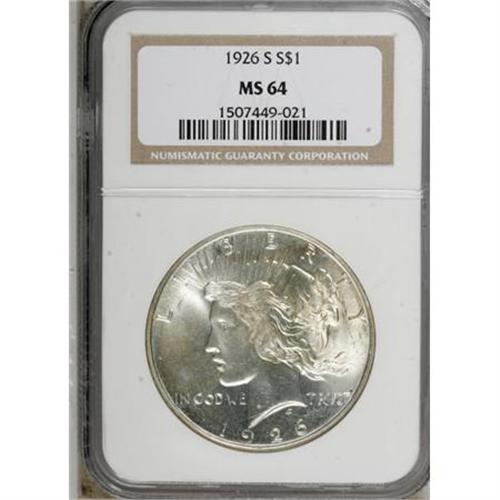<B>1926-S $1 MS64 NGC.</B></I> NGC Census: (1471/374). PCGS Population (1559/549). Mintage: 6,980,000. Numismedia Wsl. Price for NGC/PCGS coin in MS64: $220. (#7369)<BR><BR><B>Coin Engraver:</B> Anthony de Francisci<BR><BR><b>Shipping:</b> Coins & Currency (<a target="_blank" href="http://www.heritageauctions.com/common/shipping.php">view shipping information</a>)