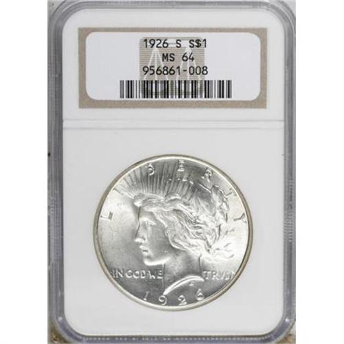 <B>1926-S $1 MS64 NGC.</B></I> NGC Census: (1475/380). PCGS Population (1593/556). Mintage: 6,980,000. Numismedia Wsl. Price for NGC/PCGS coin in MS64: $220. (#7369)<BR><BR><B>Coin Engraver:</B> Anthony de Francisci<BR><BR><b>Shipping:</b> Coins & Currency (<a target="_blank" href="http://www.heritageauctions.com/common/shipping.php">view shipping information</a>)