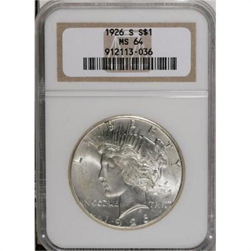 <B>1926-S $1 MS64 NGC.</B></I> . NGC Census: (1480/381). PCGS Population (1611/566). Mintage: 6,980,000. Numismedia Wsl. Price for NGC/PCGS coin in MS64: $225. (#7369)<BR><BR><B>Coin Engraver:</B> Anthony de Francisci<BR><BR><b>Shipping:</b> Coins & Currency (<a target="_blank" href="http://www.heritageauctions.com/common/shipping.php">view shipping information</a>)