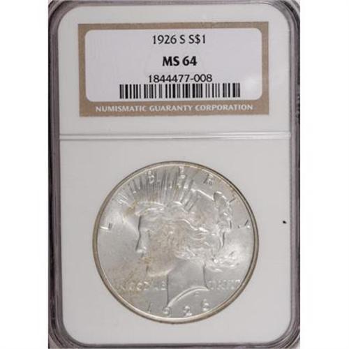 <B>1926-S $1 MS64 NGC.</B></I> NGC Census: (1495/389). PCGS Population (1652/593). Mintage: 6,980,000. Numismedia Wsl. Price for NGC/PCGS coin in MS64: $225. (#7369)<BR><BR><B>Coin Engraver:</B> Anthony de Francisci<BR><BR><b>Shipping:</b> Coins & Currency (<a target="_blank" href="http://www.heritageauctions.com/common/shipping.php">view shipping information</a>)